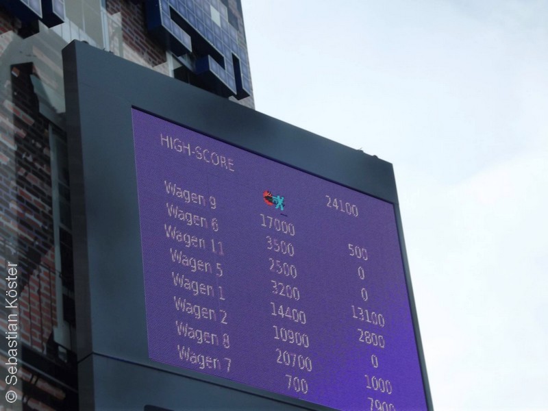 Besondere technische Herausforderung war hier, dass die Laufschrift sich synchron zu den Flügeln der Pyramide dreht und trotzdem in Echtzeit angesteuert wird, so dass Texte und Animationen jederzeit aktualisiert werden können.